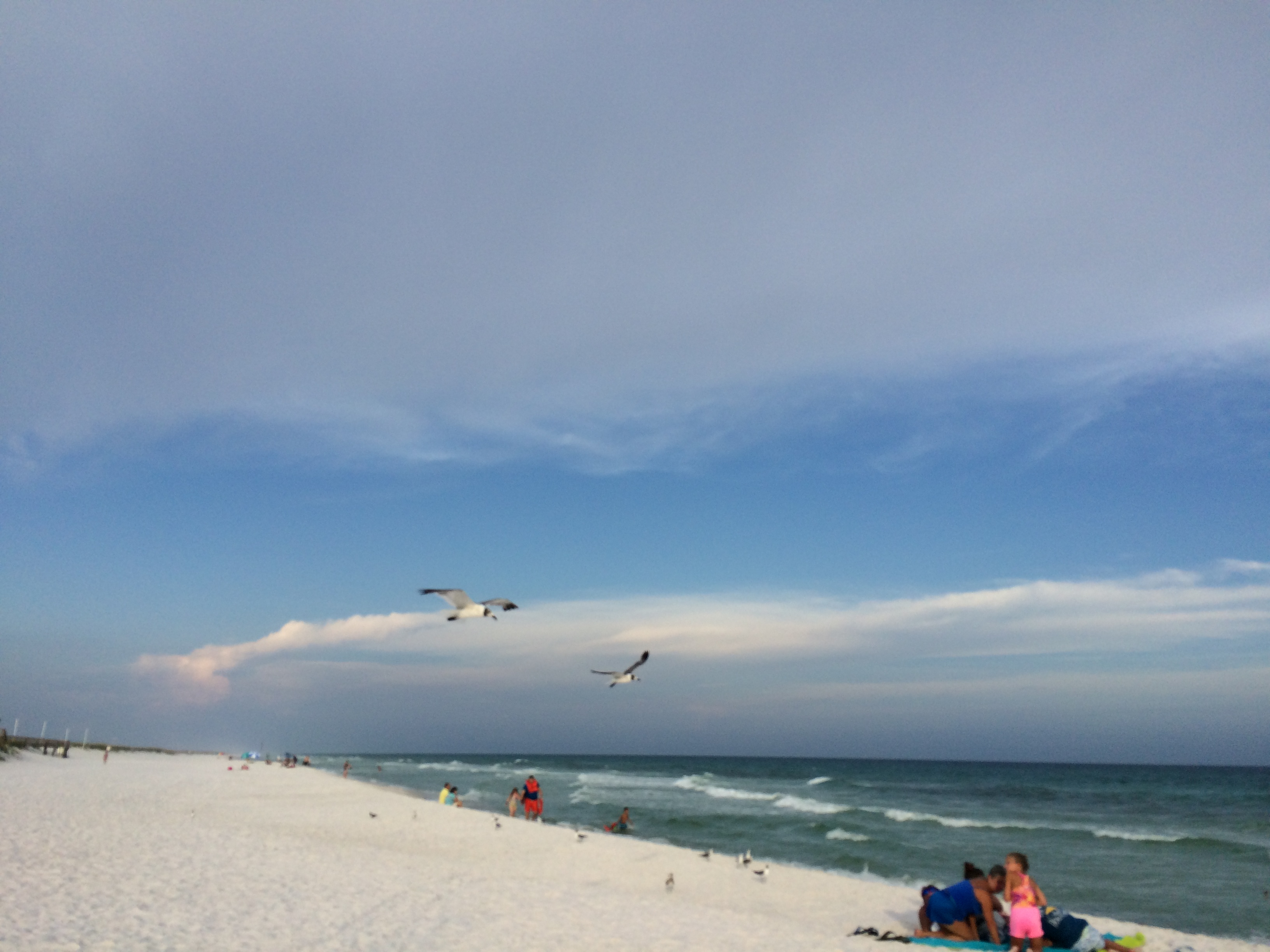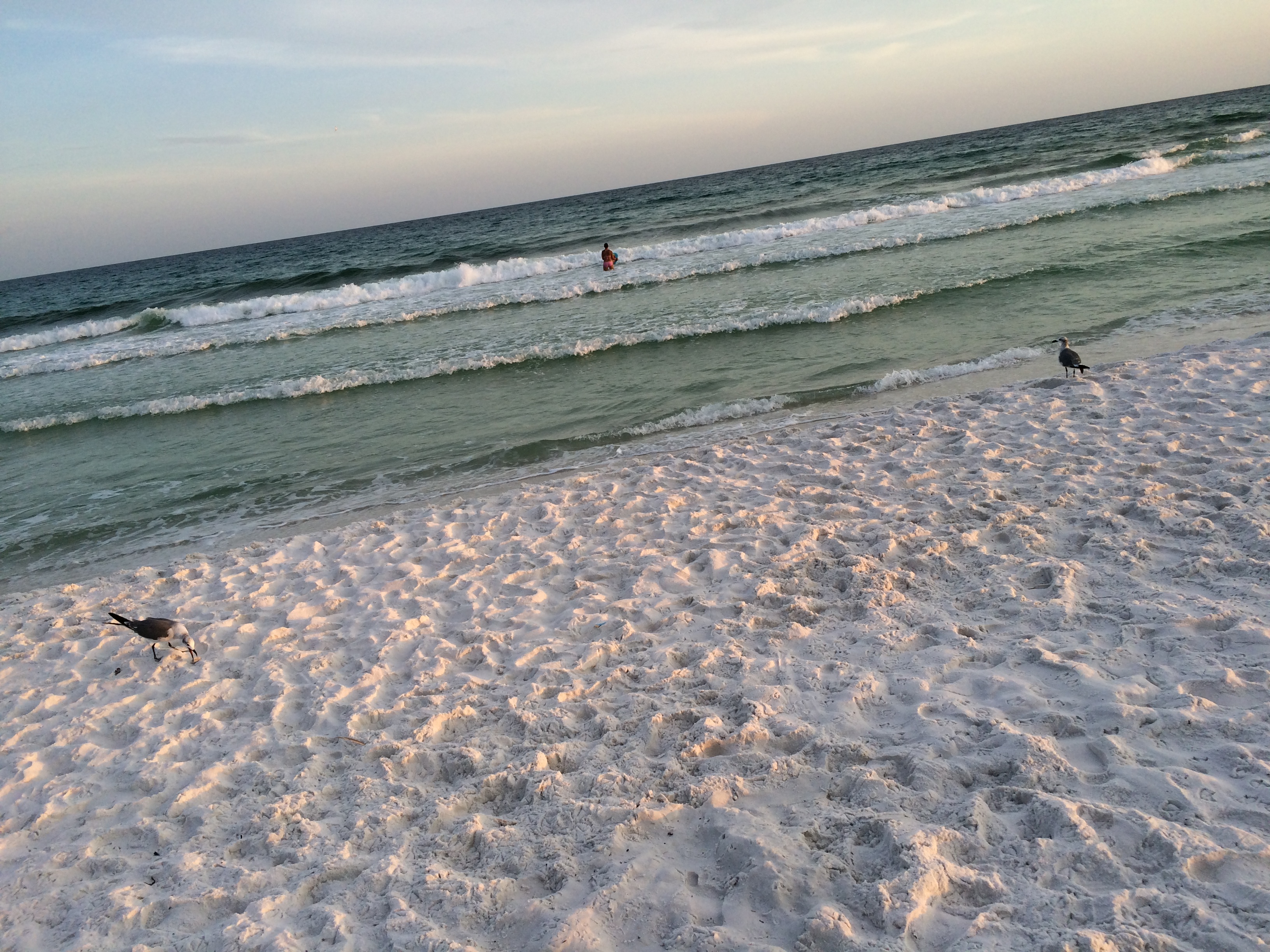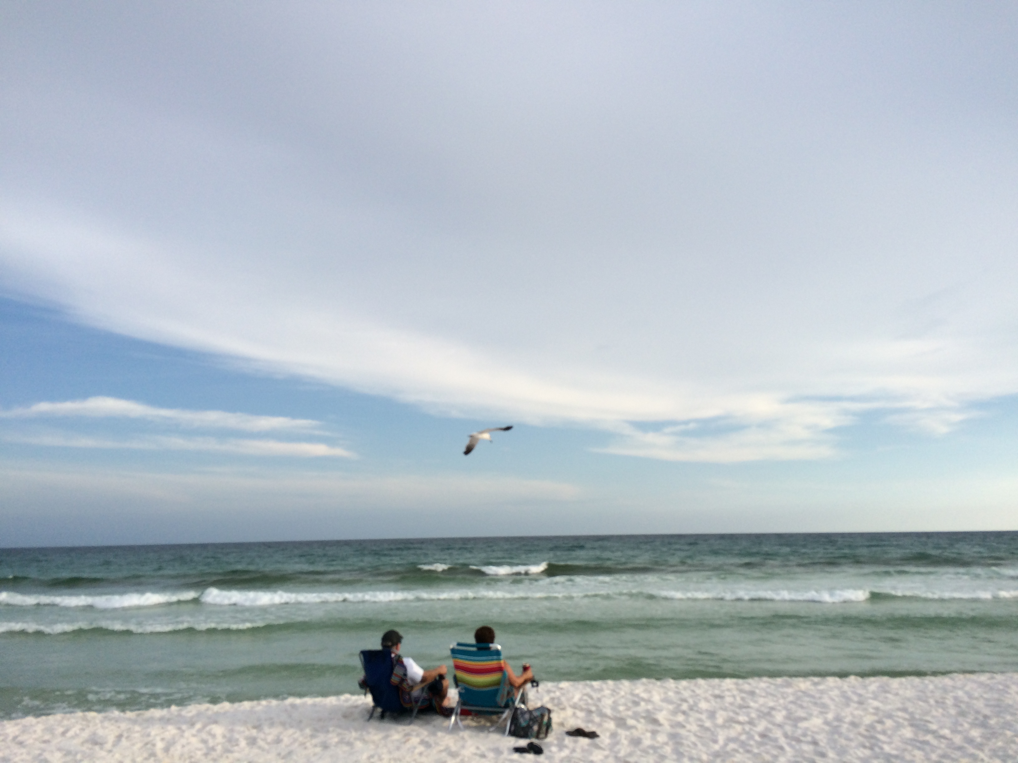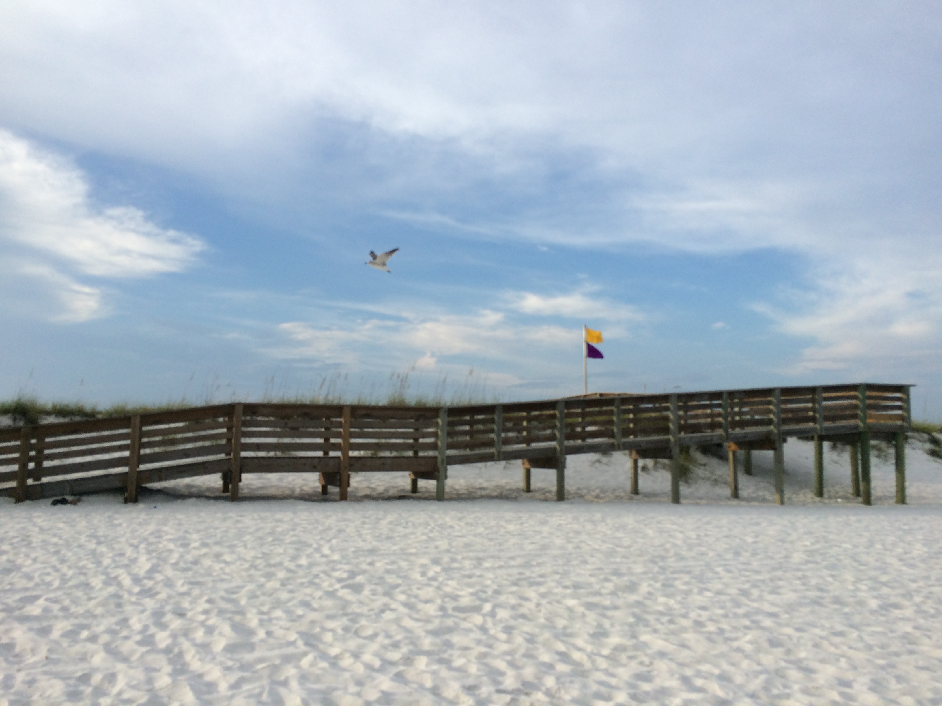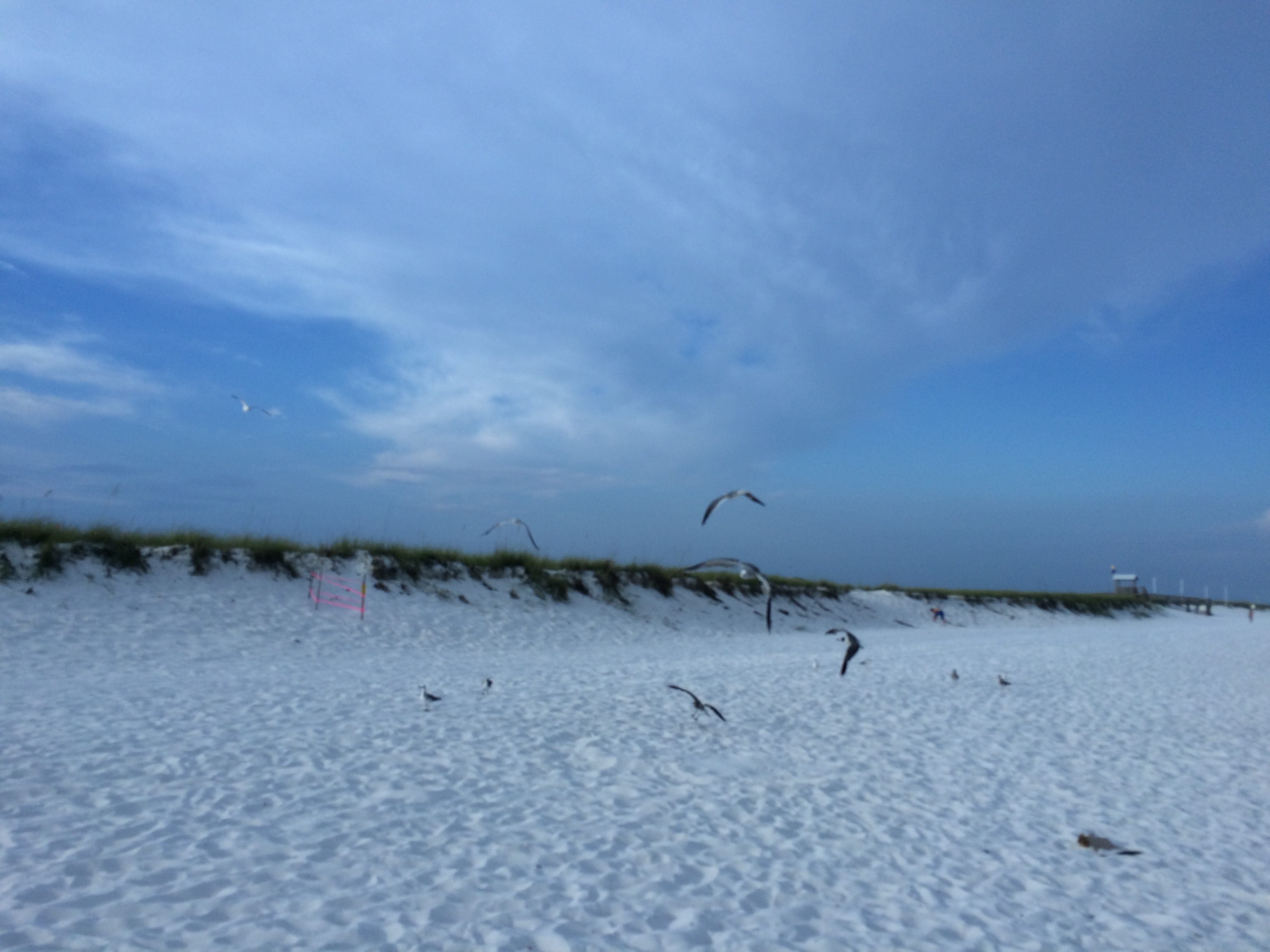 with sea oats swaying and seagulls in breeze..