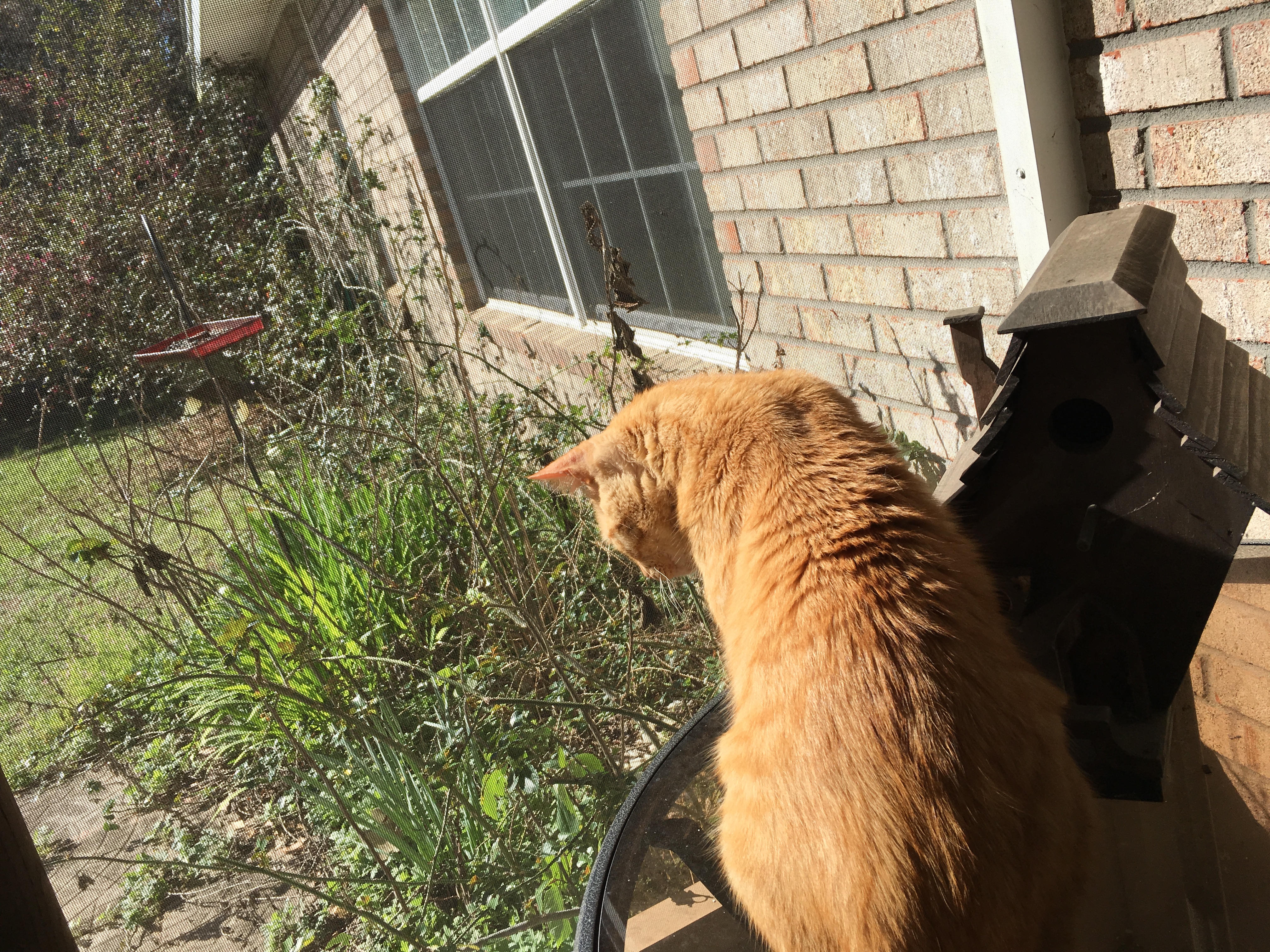 As I sit outside toward the back of my yard, in the afternoon sun, he is pacing back and forth politely, still with a humility of respect for a place of subsistence that keeps him from tearing the screen of the patio.